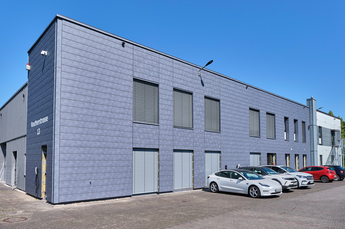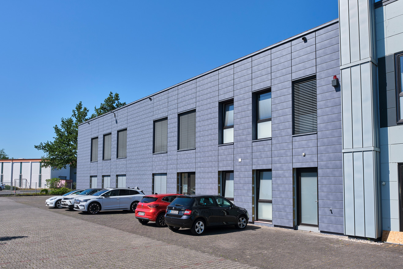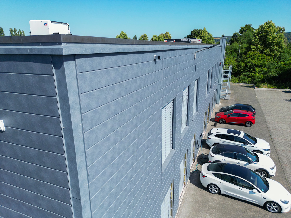 Mit dem zweiten Sanierungsschritt wurde bei der Gewerbeimmobilie in Hennef die restliche ungedämmte Außenwand energetisch ertüchtigt. Als optischen Abschluss erhielt die vorgehängte hinterlüftete Fassade PREFA Siding-Elemente in steingrau.