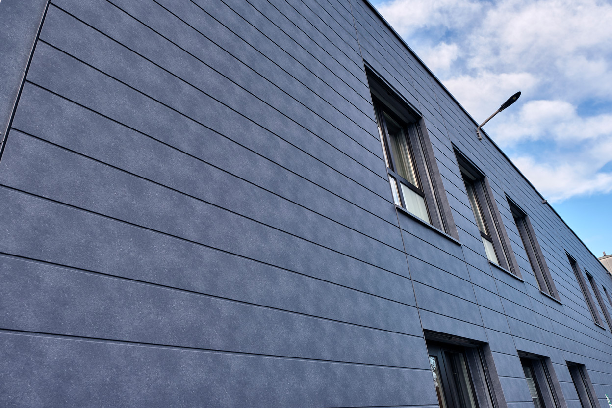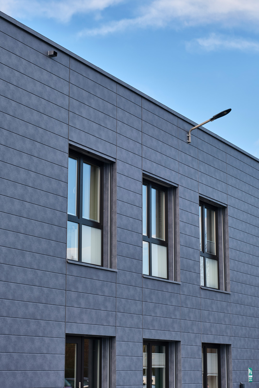 Hinter dem edlen Steingrau der vorgehängten Aluminium-Elemente wurde die Außenwand des Gebäudes ausreichend wärmegedämmt.